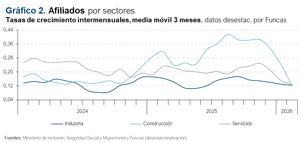 En el sector de la construcción, muy influido por dichas condiciones, el resultado de febrero mantuvo el mismo tono de debilidad que en el mes previo, con un avance desestacionalizado de unos 1.300 afiliados, que contrasta con los incrementos mensuales de más de 4.000 del año anterior. En la industria, el incremento también fue muy semejante al de enero, y algo inferior al ritmo de crecimiento promedio de 2025. Finalmente, es en los servicios, fundamentalmente, donde se refleja la mejoría con respecto a enero (gráfico 2).