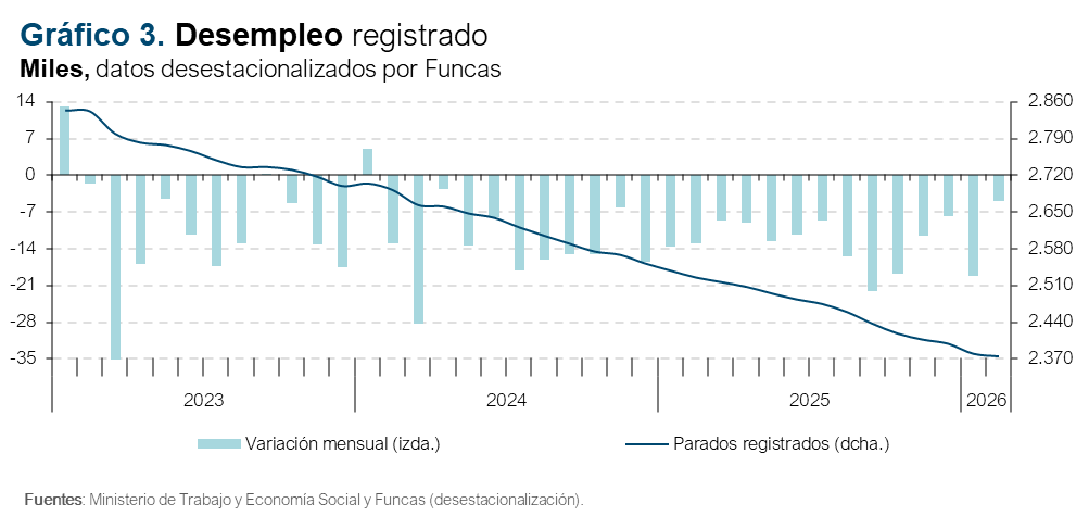 El número de desempleados registrados aumentó en 3.584 en febrero, que, según cifras desestacionalizadas por Funcas, equivale a un descenso de unos 5.000, también inferior a los descensos registrados de media a lo largo de 2025 (gráfico 3). El número de contratos en febrero se recuperó parcialmente del descenso registrado el mes anterior, tanto en los indefinidos como en los temporales. Aún así, el acumulado de enero y febrero sigue siendo inferior a la cifra del mismo periodo del año anterior.