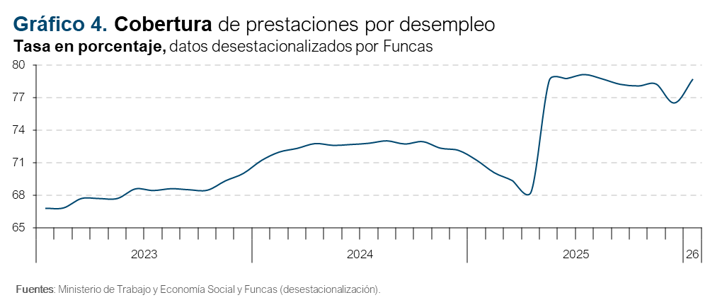 La tasa de cobertura en enero fue del 81,86%, o un 78,7% en términos desestacionalizados (cifra desestacionalizada por Funcas) (gráfico 4). Continúa, por tanto, en niveles históricamente elevados.