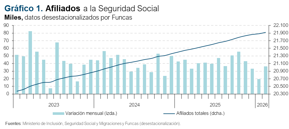 El número de afiliados a la Seguridad Social aumentó en 97.000 en el mes de febrero, cifra que equivale en términos desestacionalizados a un incremento mensual de 36.000 (datos desestacionalizados por Funcas) (gráfico 1). Este resultado supone una mejoría con respecto al débil avance de enero, aunque sigue situándose por debajo de los incrementos mensuales medios de 2025. No obstante, hay que tener en cuenta que las condiciones meteorológicas siguieron siendo negativas durante la mayor parte del mes.