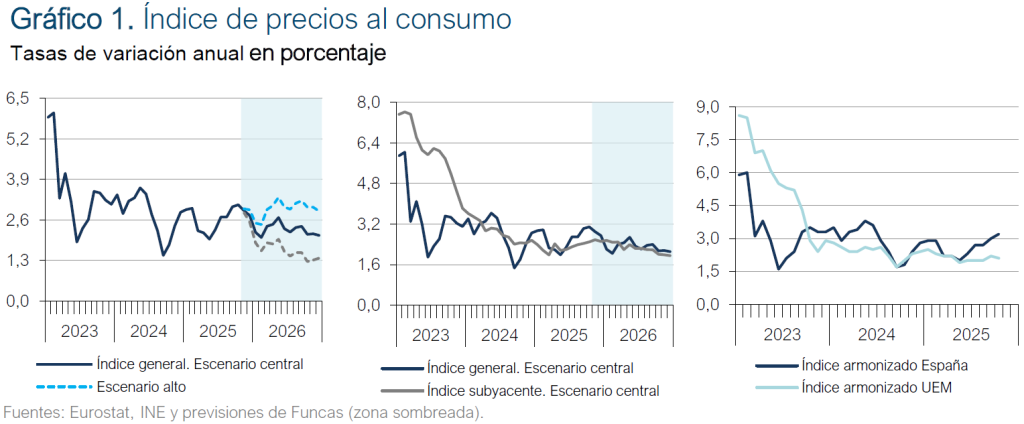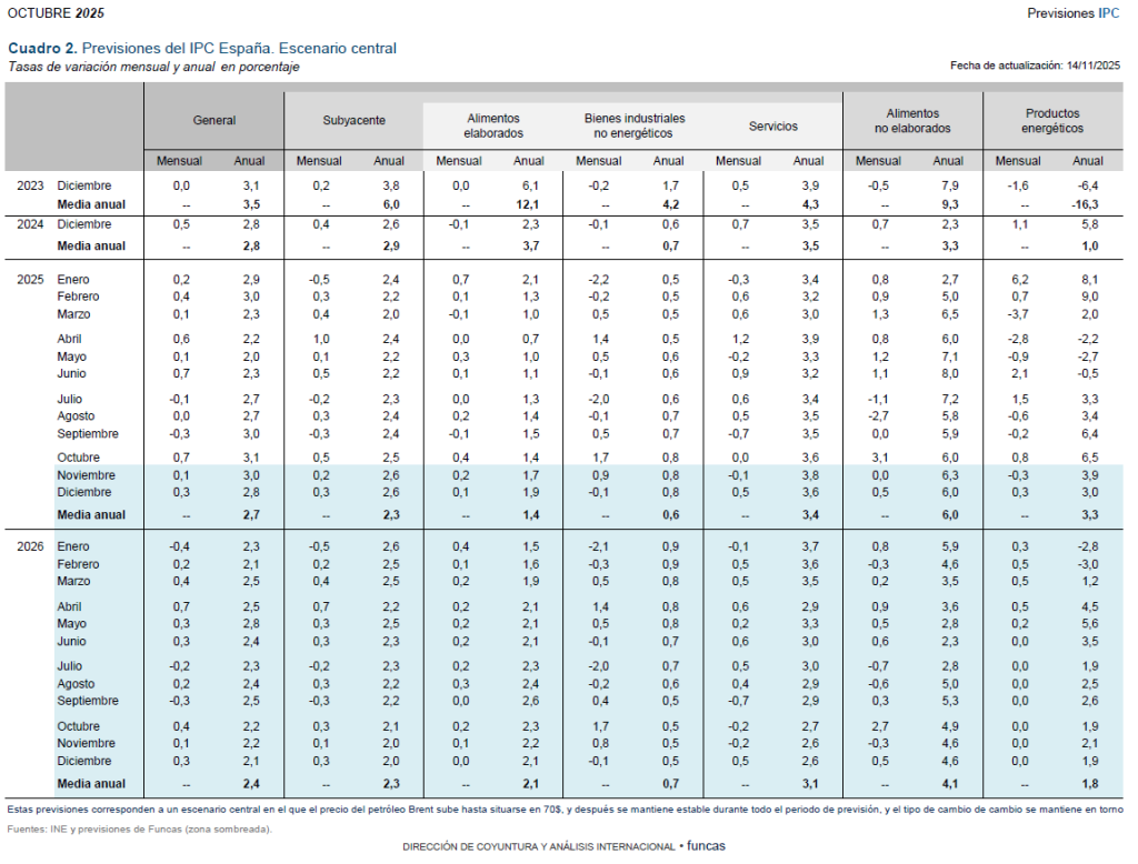El precio del crudo se ha situado en torno a 65$ en las últimas semanas, algo por debajo incluso del mes anterior. No obstante, en el escenario central de previsiones se mantiene la hipótesis de que la cotización de esta materia prima se elevará hasta los 70$ en el primer trimestre de 2026, manteniéndose después estable. Como consecuencia de la incorporación de los resultados peores de lo esperado de octubre, las previsiones de inflación en este escenario central se han elevado. Para noviembre y diciembre se esperan descensos, debido al final de sendos efectos escalón en los productos energéticos, que en esos meses del año pasado registraron incrementos importantes. La tasa de diciembre sería del 2,8% (dos décimas más que en la anterior previsión). La media del periodo diciembre 2024-noviembre 2025, utilizada para la actualización de las pensiones, será probablemente del 2,7%. Para 2026 se espera una tasa media anual del 2,4% en el IPC general, y del 2,3% en el subyacente (cuatro y dos décimas más que en la anterior previsión) (cuadro 2).
