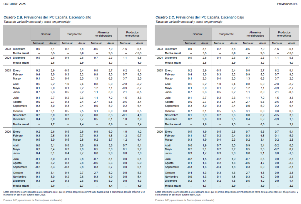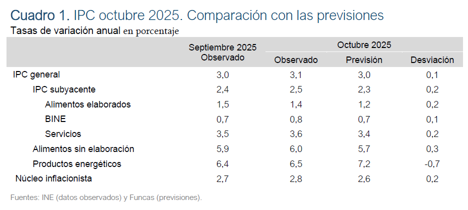 El IPC general aumentó un 0,7% en octubre, elevando la tasa interanual de inflación en una décima porcentual hasta el 3,1%, la más alta desde junio del pasado año. La tasa armonizada se elevó en dos décimas, hasta el 3,2%, lo que supone 1,1 puntos porcentuales por encima de la media de la eurozona, el diferencial más elevado también desde junio de 2024. La tasa subyacente ascendió igualmente, hasta el 2,5%, mientras que el núcleo inflacionista –que recoge los precios de los bienes no energéticos y los servicios– se elevó en la misma cuantía, hasta el 2,8%.