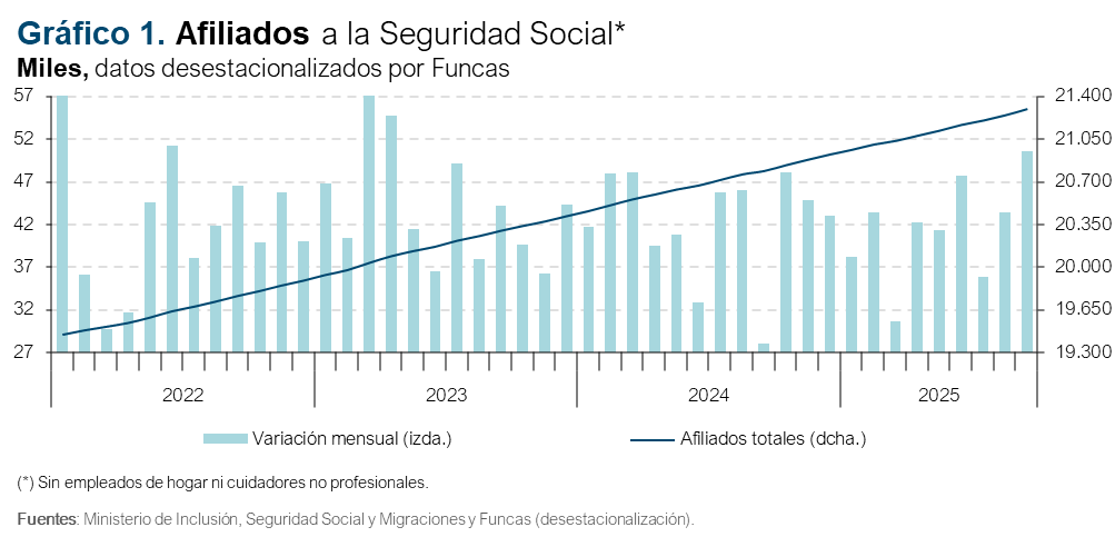 El número de afiliados a la Seguridad Social aumentó en 31.462 en septiembre, un dato superior al habitual en un mes de septiembre. En términos desestacionalizados equivale a un crecimiento mensual de 50.000 (cifras desestacionalizadas por Funcas), el mayor avance mensual desde hace algo más de dos años (gráfico 1).