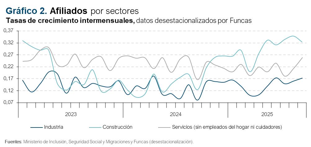 Han sido los servicios los que han arrojado un resultado más destacado, con un aumento en términos desestacionalizados de 42.000 en septiembre frente a un crecimiento promedio de 33.000 entre enero y agosto. El avance de septiembre ha procedido fundamentalmente de los subsectores de Administraciones Públicas, sanidad y servicios administrativos y auxiliares. Por otra parte, el resultado ha sido bueno en la industria, aunque el incremento se encuentra dentro del rango de los resultados observados a lo largo del año. En la construcción, el crecimiento ha sido algo inferior al mes anterior, pero se mantiene dentro de una tendencia de aceleración (gráfico 2).