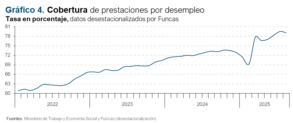 La tasa de cobertura fue del 82,5%, o un 79,2% en términos desestacionalizados por Funcas (gráfico 4). Continúa, por tanto, en niveles muy superiores a los de años anteriores –con excepción del periodo de la pandemia–, y similares a los alcanzados durante la crisis de 2008.