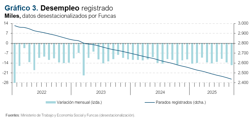 El número de desempleados registrados en septiembre se redujo en 4.846, lo que en términos desestacionalizados equivale a un descenso de 15.500 –cifra desestacionalizada por Funcas–, una de las mayores bajadas de los últimos dos años (gráfico 3). Los demandantes de empleo ocupados, entre los que se encuentran los trabajadores con contratos fijos discontinuos, han descendido en 118.000, frente a una caída de 109.000 en el mismo mes del pasado año.