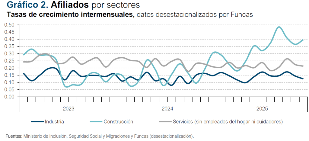Por sectores, en la agricultura se sigue destruyendo empleo, mientras que el resto continúan creando empleo a un ritmo similar al observado desde el comienzo del año (gráfico 2). Dentro de los servicios, la afiliación en la hostelería ha ralentizado a lo largo del ejercicio su ritmo de crecimiento –desde tasas interanuales del orden del 4% a finales de 2024 y comienzos de 2025, hasta tasas de en torno al 2,2% en los últimos meses–, lo que ha sido compensado con la aceleración en otras ramas, como transporte y almacenamiento, e información y comunicaciones.