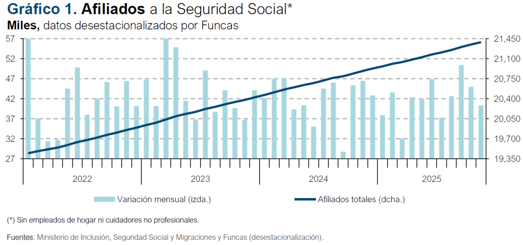 El número de afiliados a la Seguridad Social descendió en 14.358 en noviembre, cifra que, en términos desestacionalizados equivale a un incremento de 40.000 (cifras desestacionalizadas por Funcas), en línea con los resultados registrados a lo largo del año (gráfico 1).