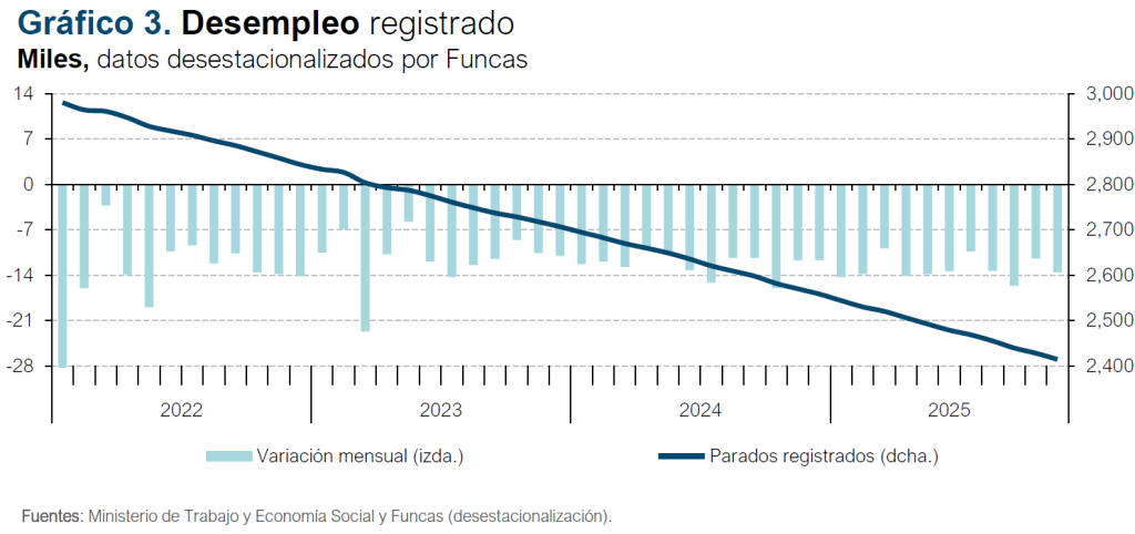 En octubre de 2025 el número de beneficiarios de prestaciones por desempleo se situó en 1,773 millones, un 0,9% más que en el mismo mes del año anterior. Por otra parte, el gasto en prestaciones aumentó un 4,4% interanual, hasta 2.006 millones de euros.