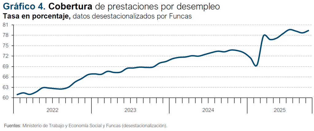La tasa de cobertura en octubre fue del 77,7%, o un 79,4% en términos desestacionalizados (cifra desestacionalizada por Funcas) (gráfico 4). Continúa, por tanto, en niveles cercanos a los máximos históricos alcanzados en la crisis financiera, con la excepción del periodo de la pandemia.